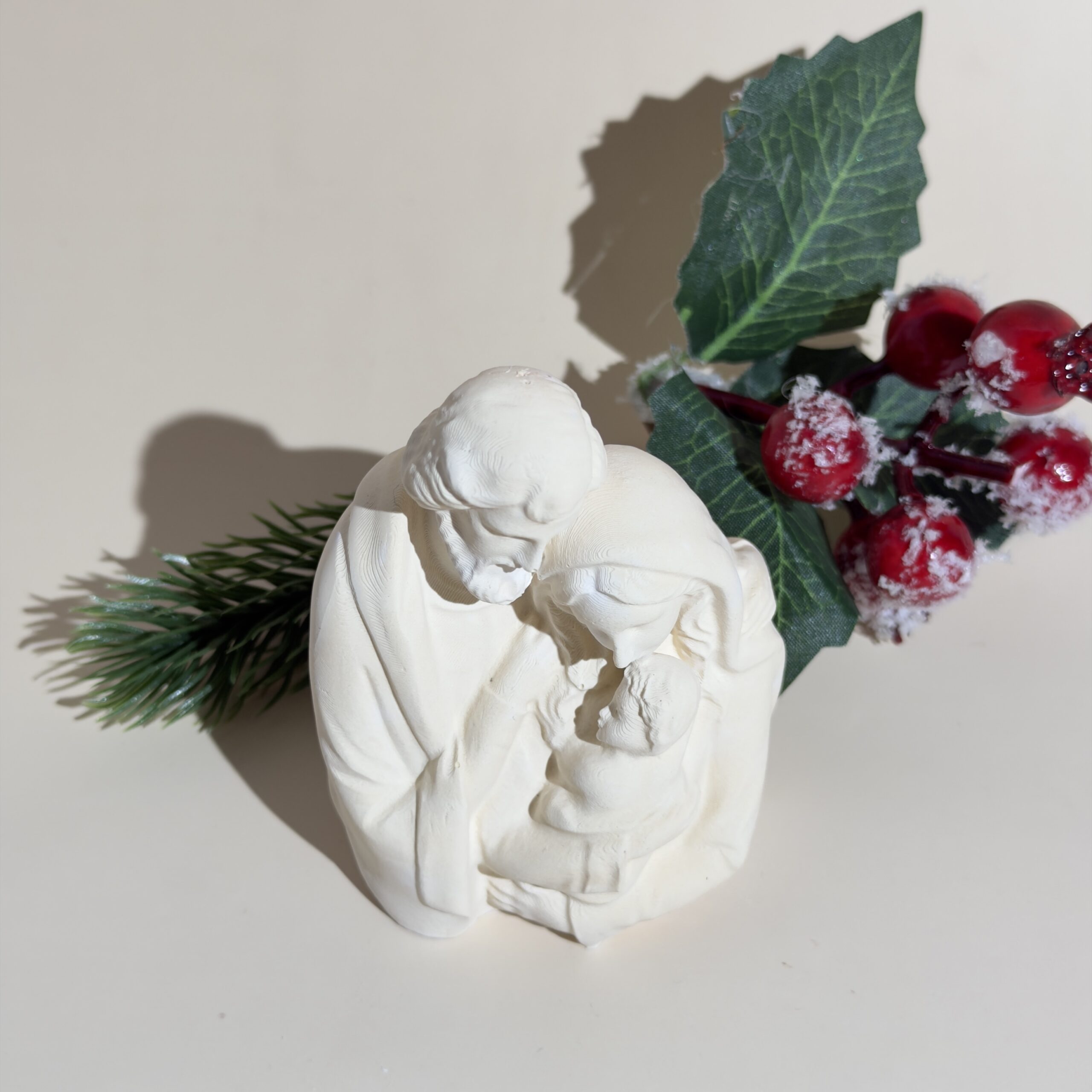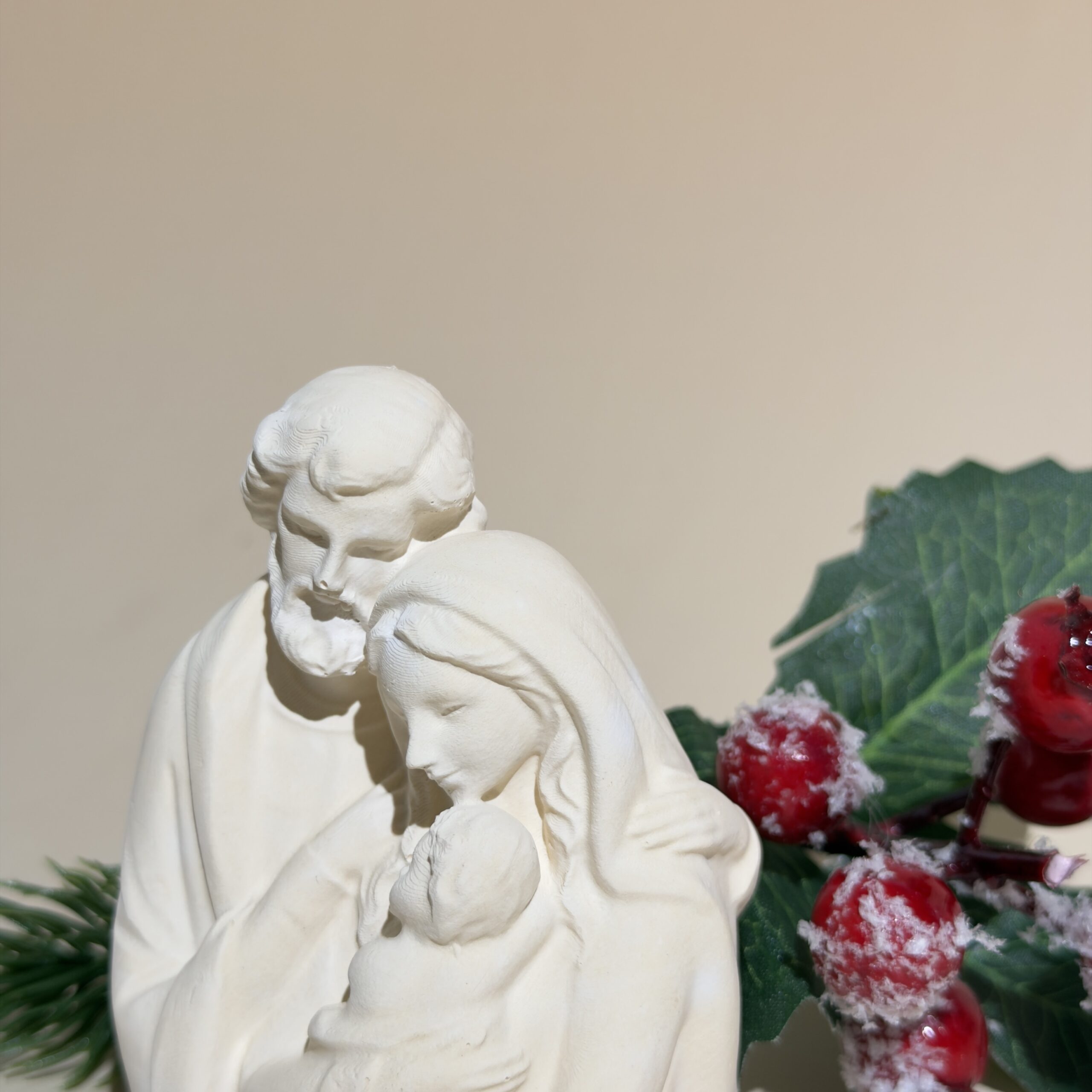 Estátua artesanal da Sagrada Família Evanthía em cerâmica, feita à mão com acabamento rústico, ideal para decorações religiosas e cantinhos de oração.