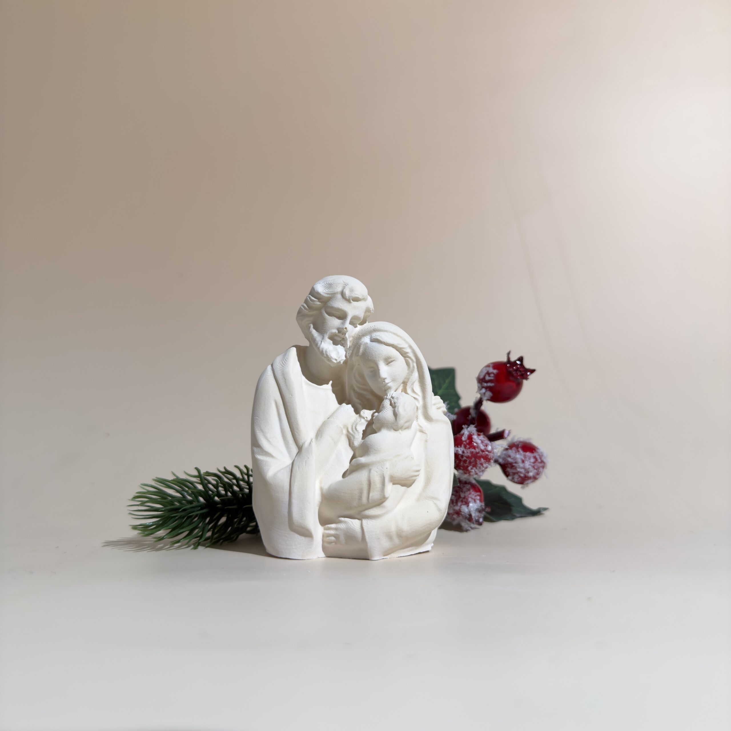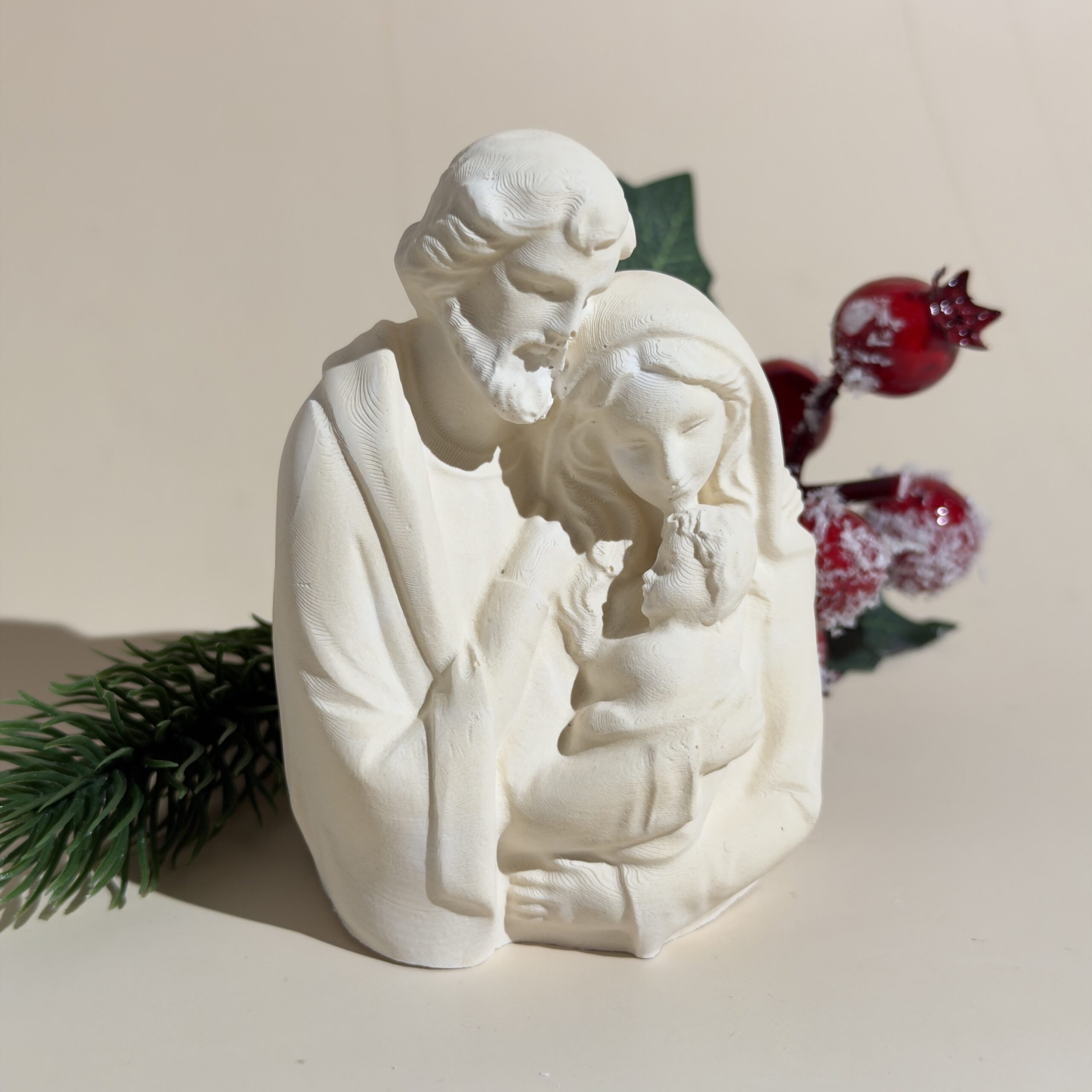 A escultura é feita em cerâmica com acabamento manual, mantendo uma aparência rústica que remete à argila natural. As texturas visíveis nos cabelos e mantos ressaltam o trabalho artesanal, tornando cada peça única. O toque terroso e a expressão serena dos personagens fazem dela uma excelente opção para quem deseja expressar sua fé com autenticidade.